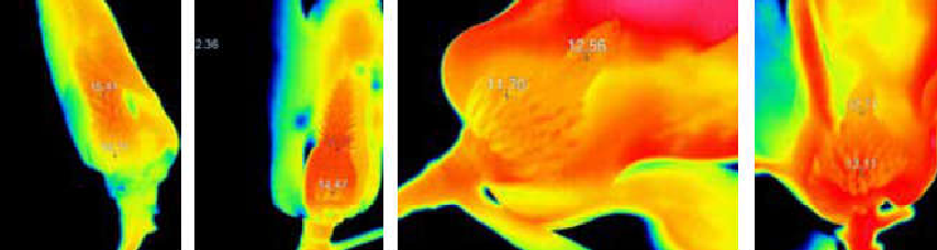 適宜的溫濕度對于植物的生長繁殖和花粉的發育、傳播、柱頭授粉、花粉管生長、種子發育等過程有著重要的作用。 為了最大限度的提高培養的成功率,研究花朵內部溫度分布情況有助于更好了解植物生長發育特性。 例如,使用紅外熱像儀拍攝并記錄玉蘭花花期過程,不同時期花芽的溫度分布,對研究玉蘭花開花過程中花朵自熱過程有著重要意義。 花蕊中雌蕊和雄蕊的粗細在1mm左右,檢測目標極小,使用紅外熱像儀則可以清晰顯示雌蕊和雄蕊的形態。 另外為了減少剛摘下的花朵自身熱量快速流失,需要在極短完成調焦和拍攝,紅外熱像儀快速拍攝的功能完美解決了這一問題。