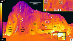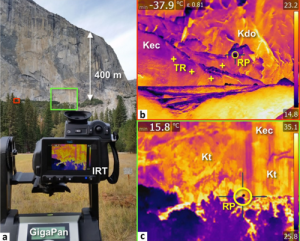 為了滿足這一需求,瑞士洛桑大學地球科學研究所通過將紅外熱成像技術與地面激光掃描技術結合起來,遠程檢測位于優勝美地山谷(美國加利福尼亞州)的El Capitan的東南面完整的巖石橋。在1000米高的懸崖上進行了四個小時的紅外熱監測,該溫度已在溫度下校準并進行了發射率效應校正。在兩個定界的剝落薄片表面上出現的熱異常現象解釋為巖石橋存在的跡象,得出了可能的巖石橋梁大小的估計值,然后將其用于評估兩個受監控的剝離薄片的穩定性條件。